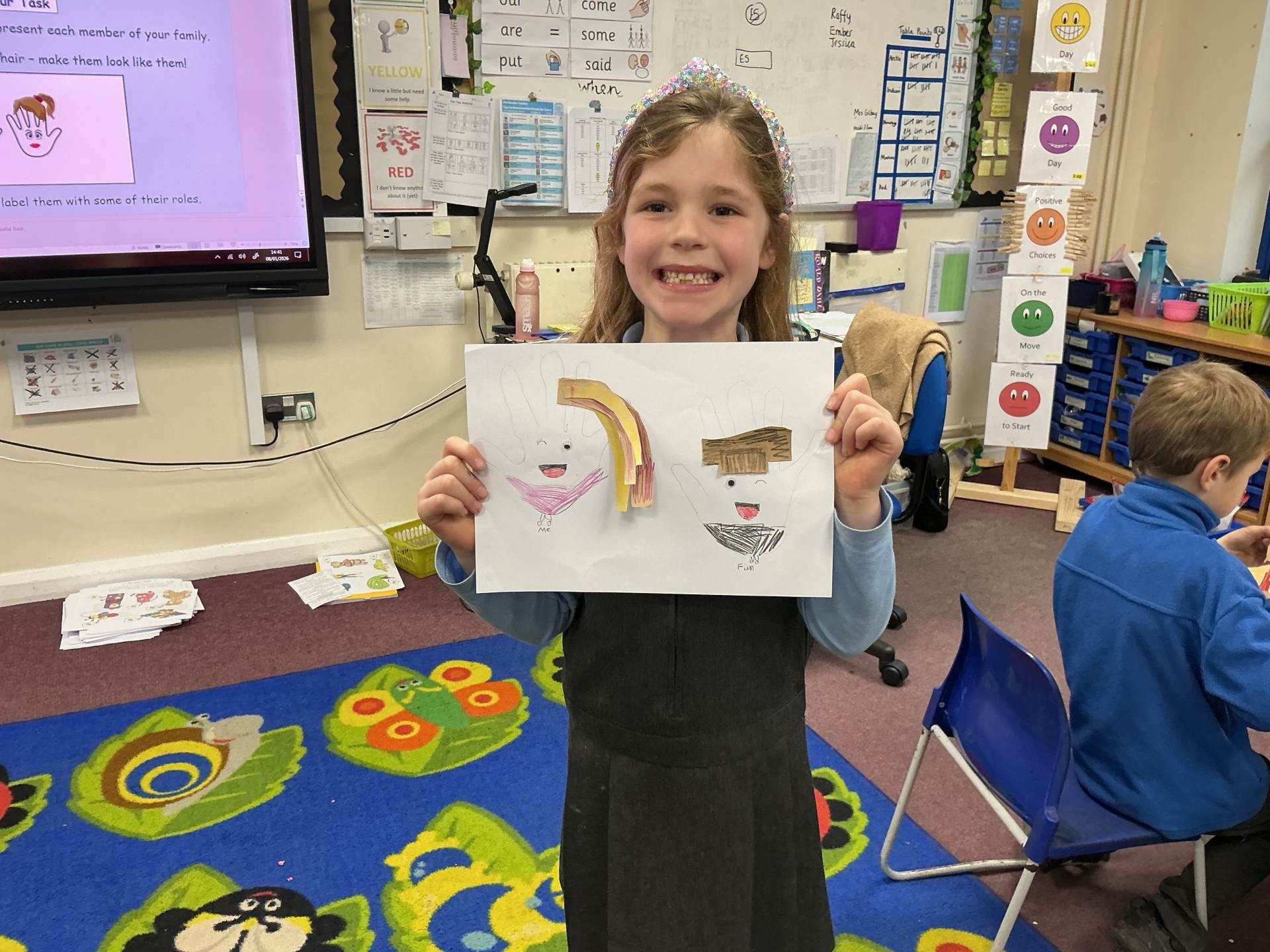 Our focus religion in RE this half term is Hinduism. In today?s lesson we learnt about how much they value their families and how they consider each family to have their own role. We drew around our own hands to represent our families.