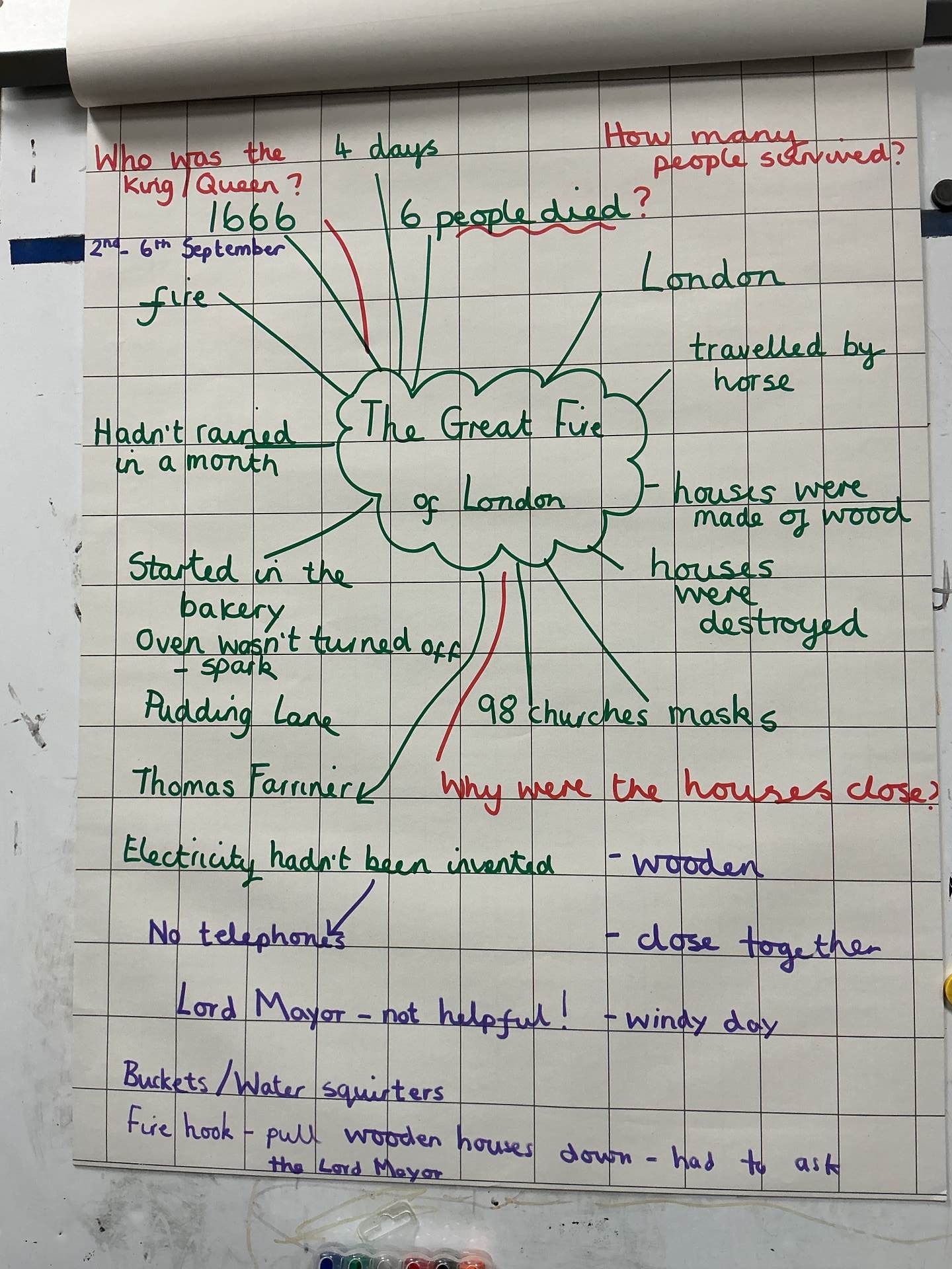 Today the children have had a brilliant day learning all about The Great Fire of London. They started off creating a mind map of what they already knew. They then built paper houses ready to burn the next day(as it was too rainy today). After break they made collage pictures depicting the great fire. During the afternoon, they performed a dance learning about how the fire started in Pudding Lane. At the end of the day, the children learnt the song September 1666.