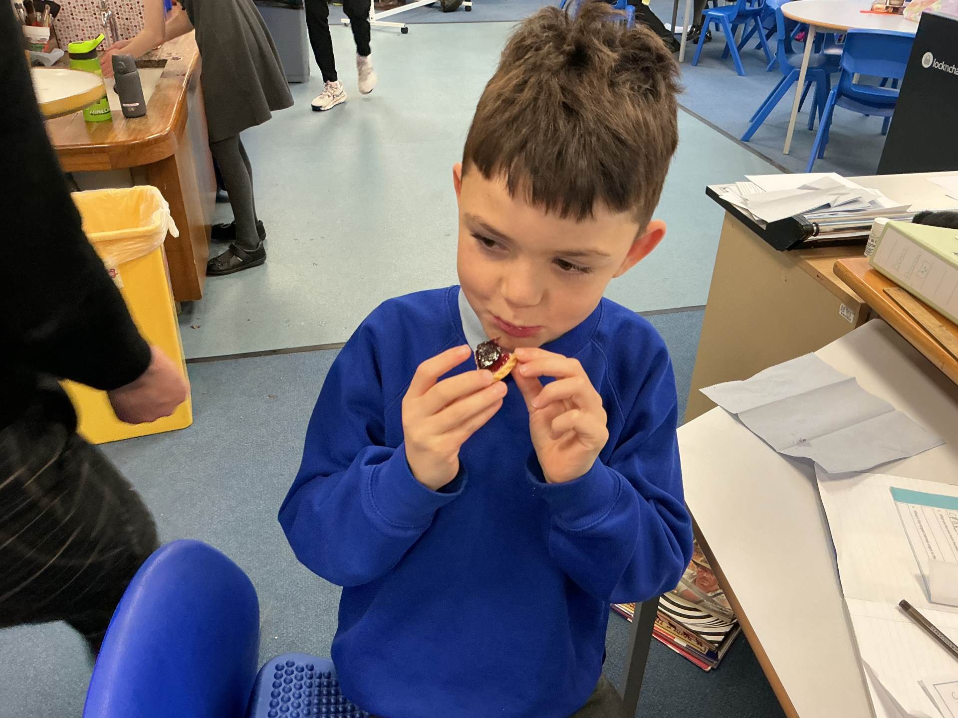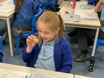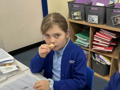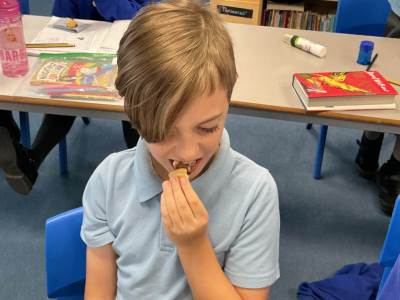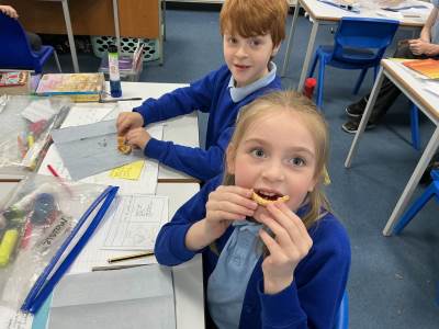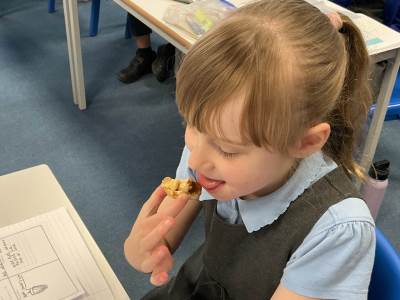 Today we started our D.T. Topic of making mince pies. We spent some time looking at the features of mince pies and then tried some. We also tried jam tarts to give us more inspiration.