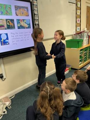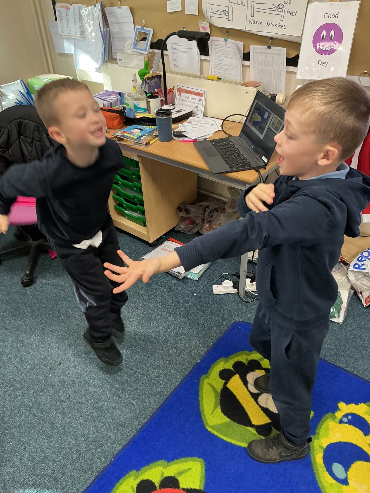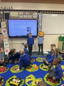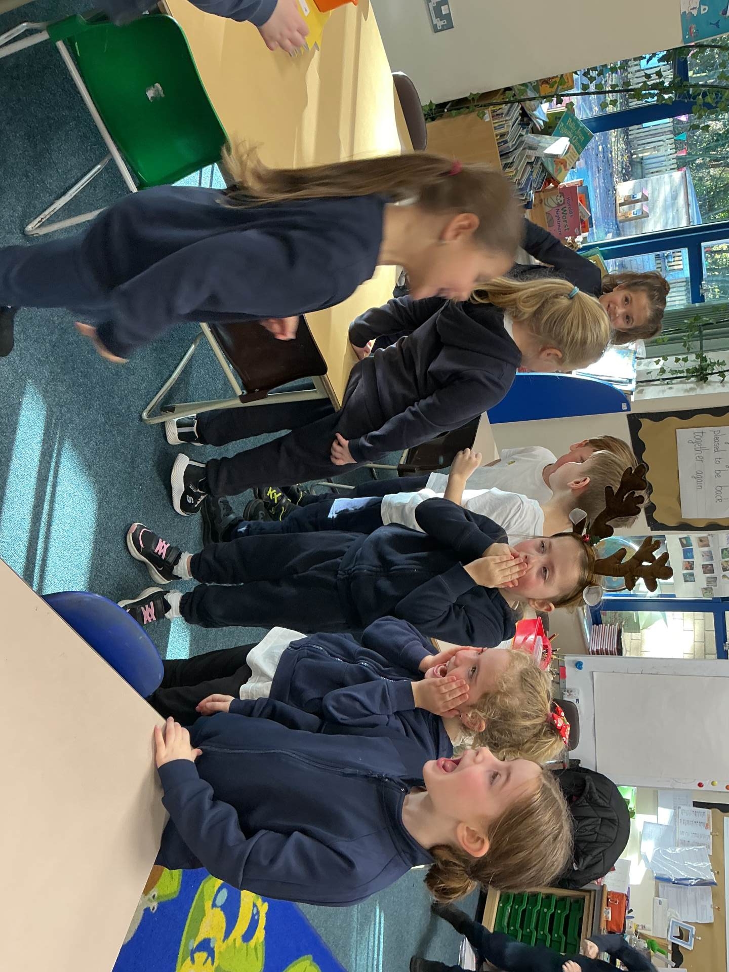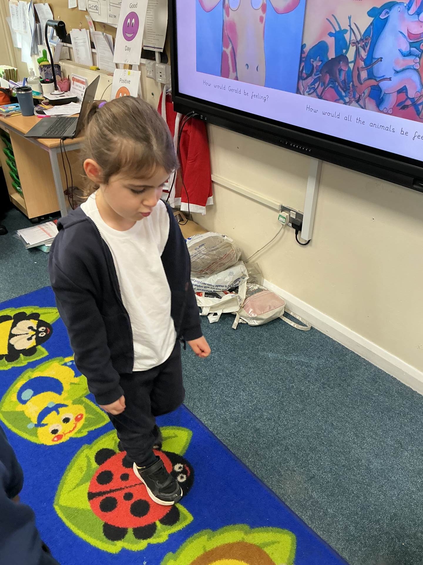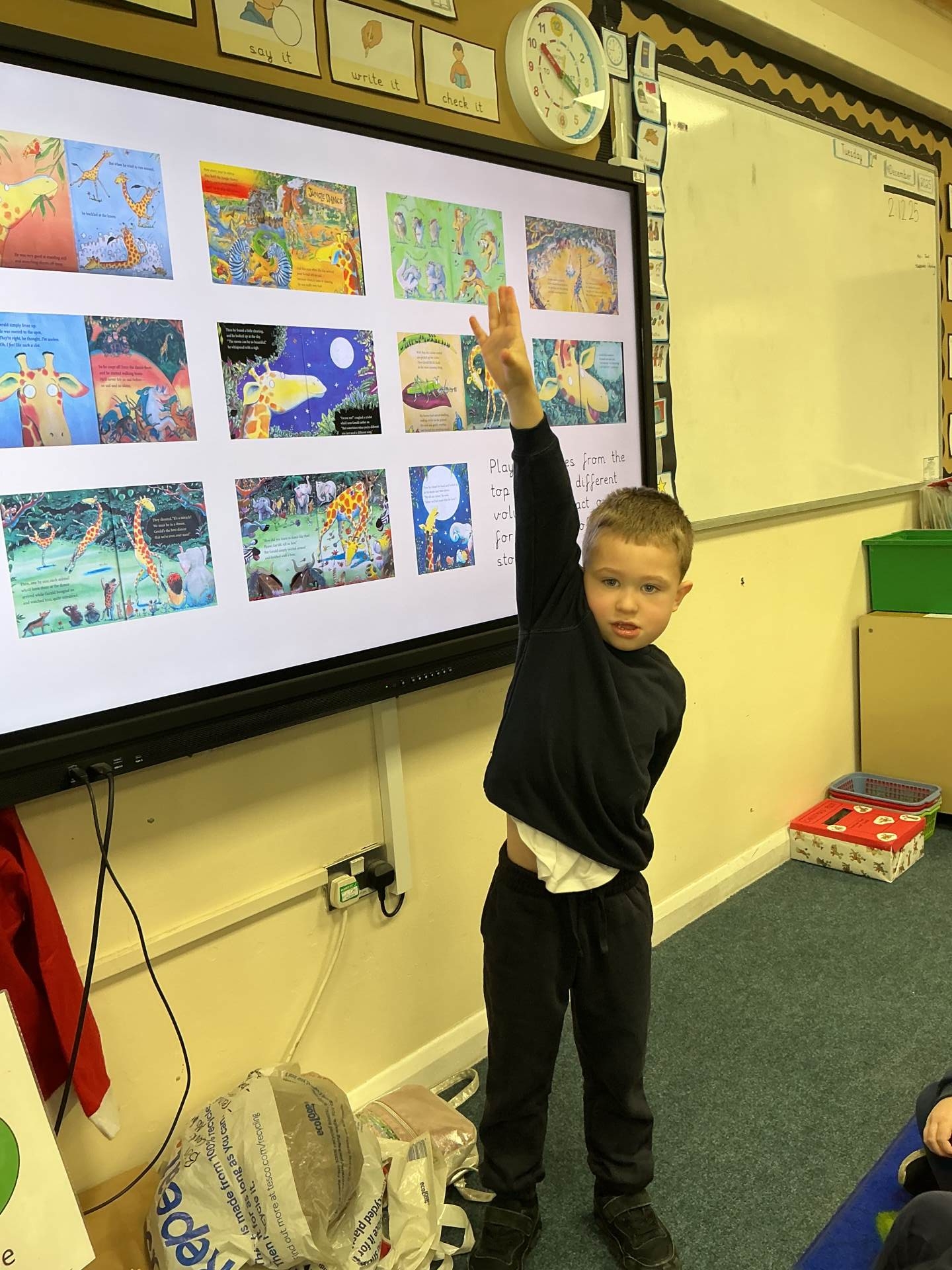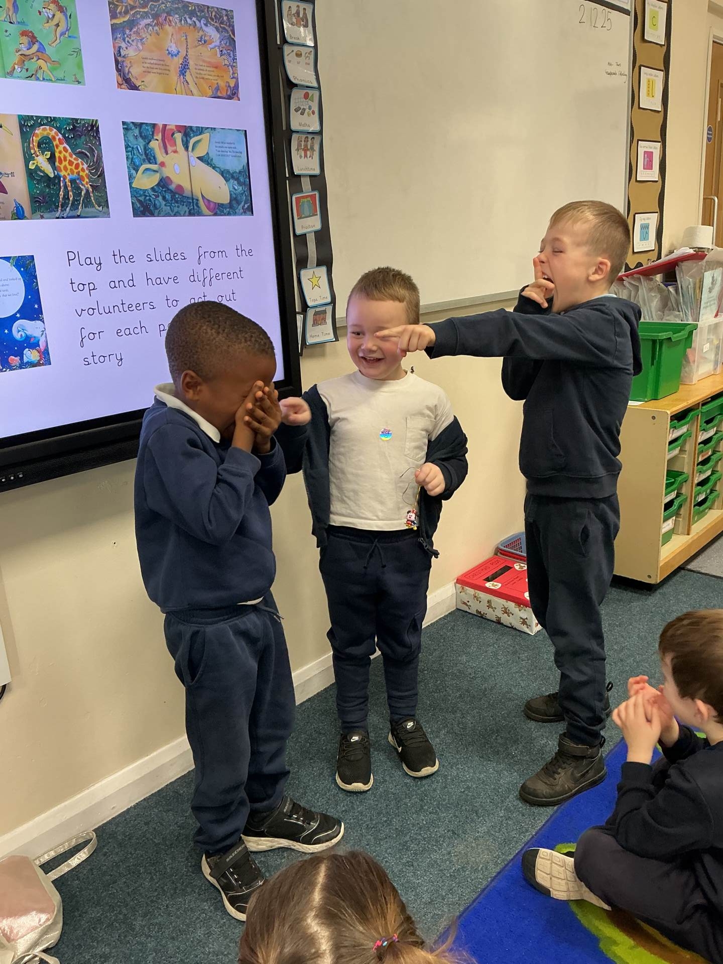 We were acting different parts of the story in the book Giraffes Cant Dance.