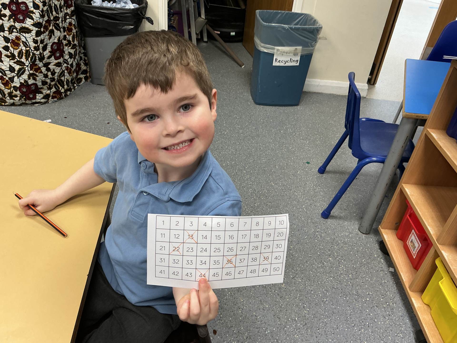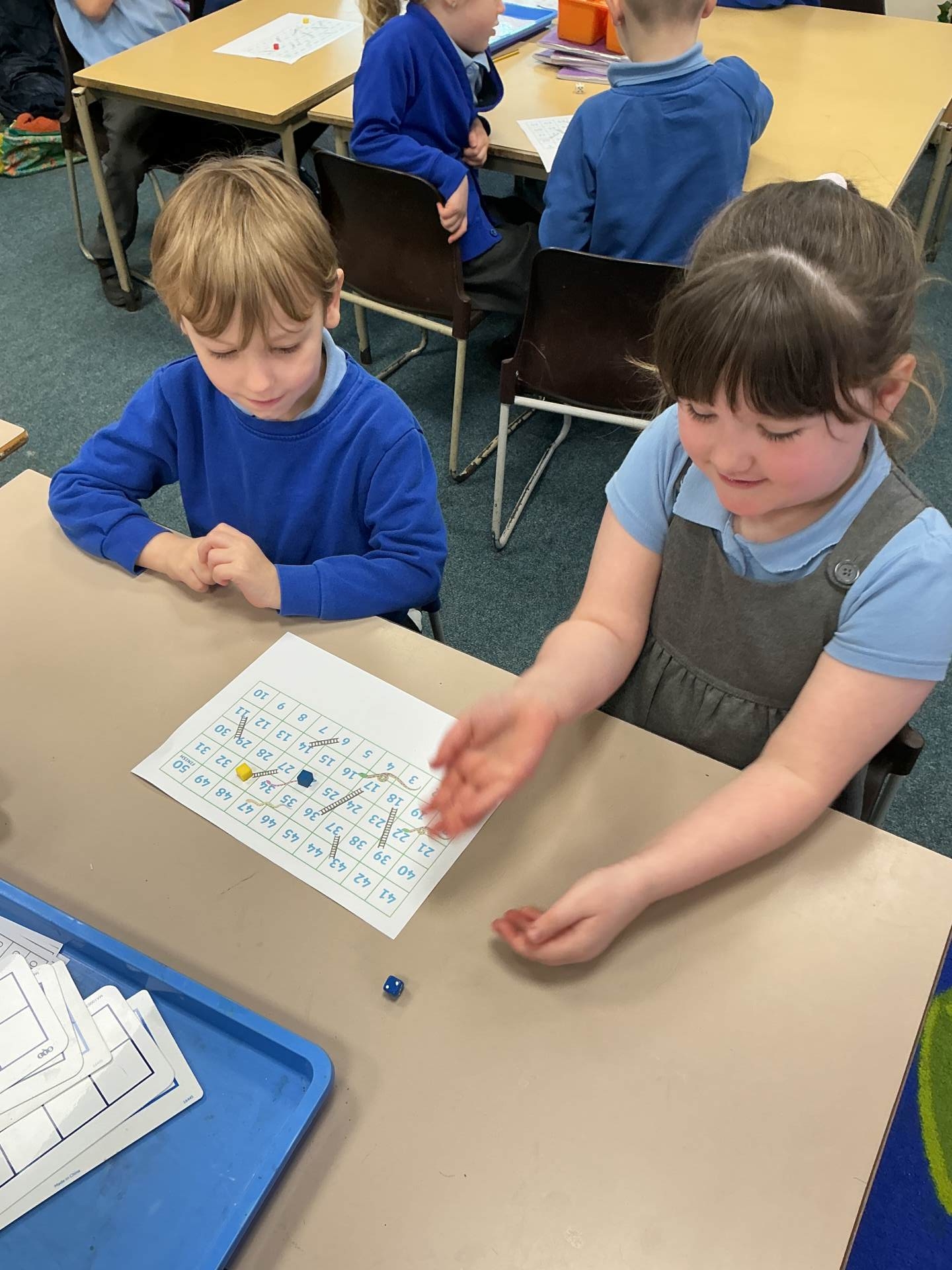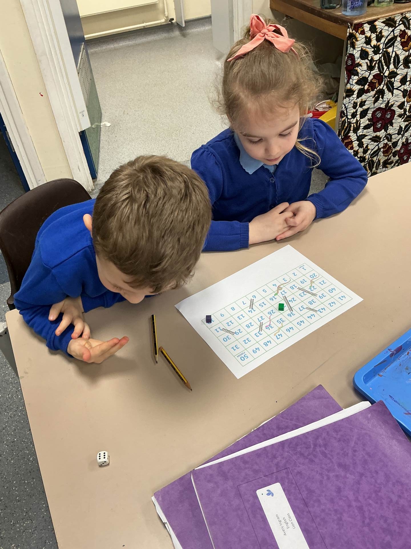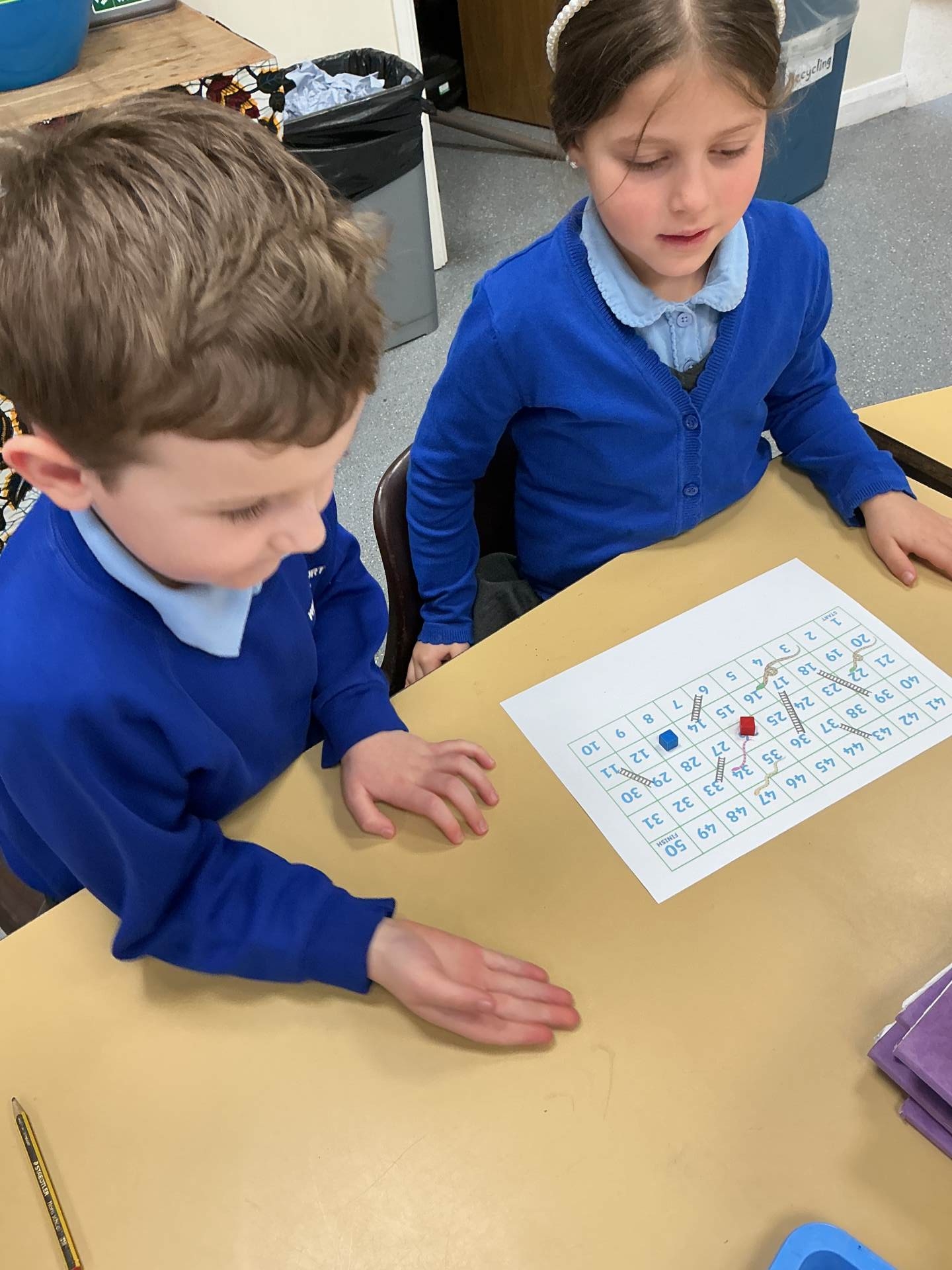 Maths - we were looking at numbers 1-50 getting used to what order they go in playing snakes and ladders and becoming more familiar with where they appear in a number square playing bingo.