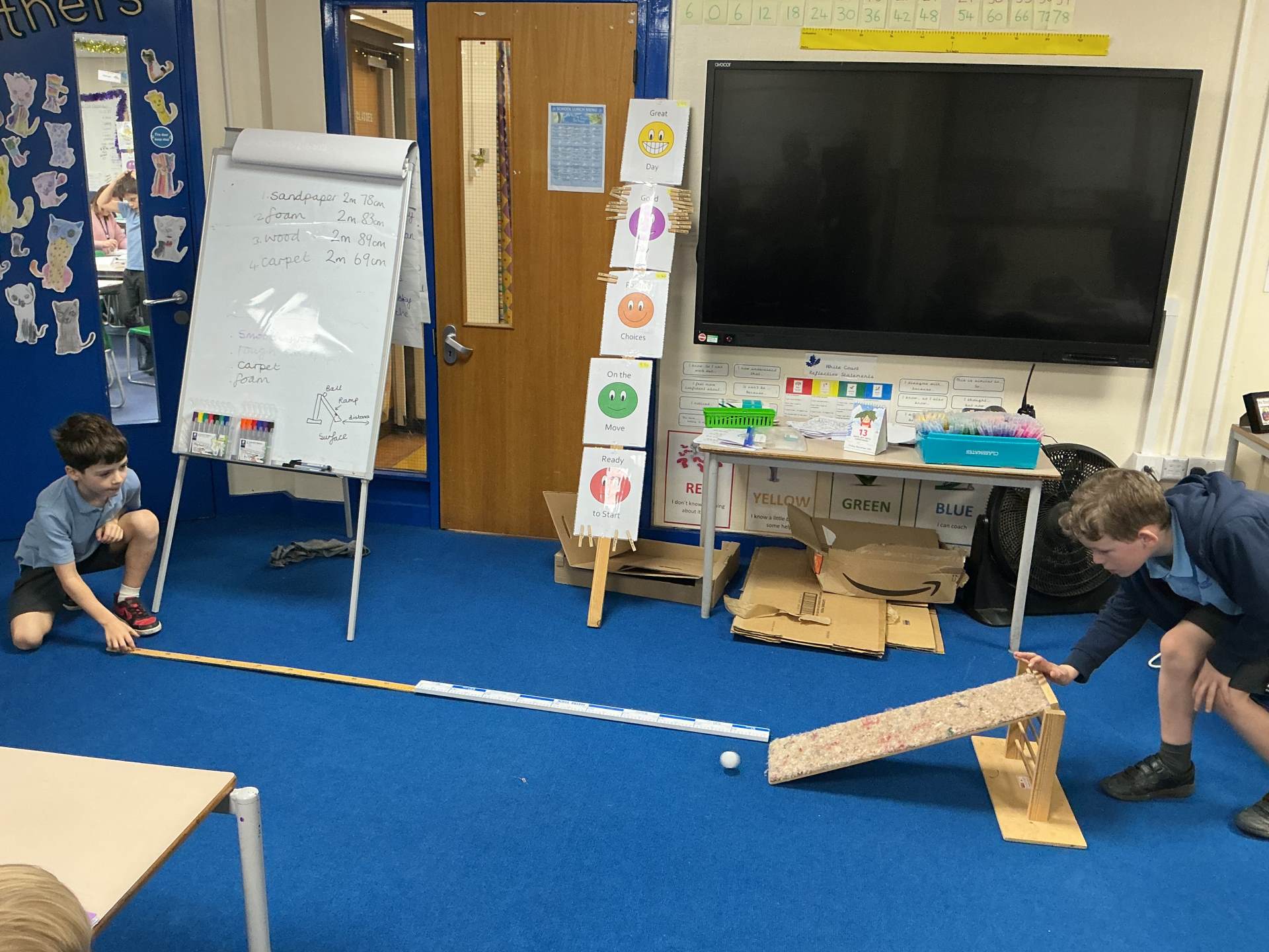 We carried out a science experiment to see which surface made the ball roll further. It was great fun!